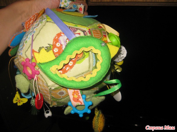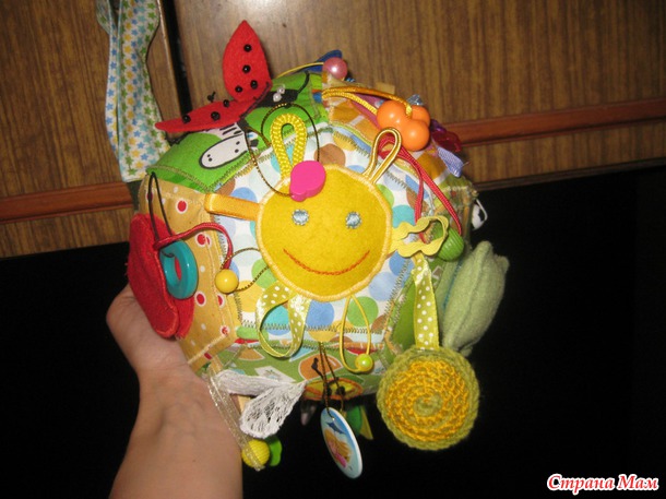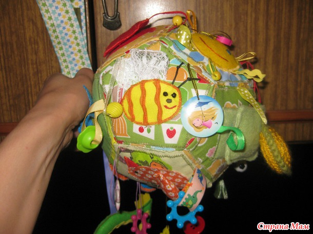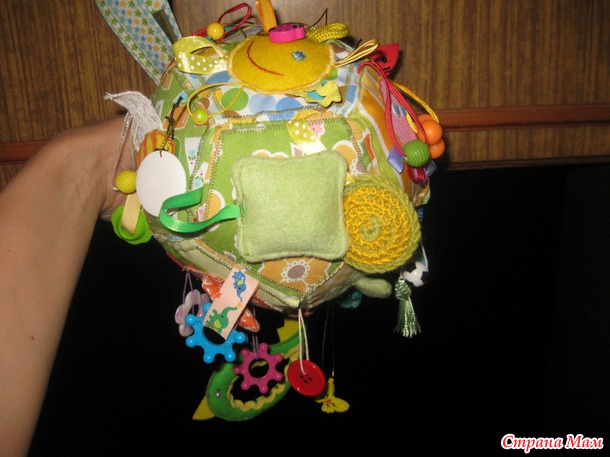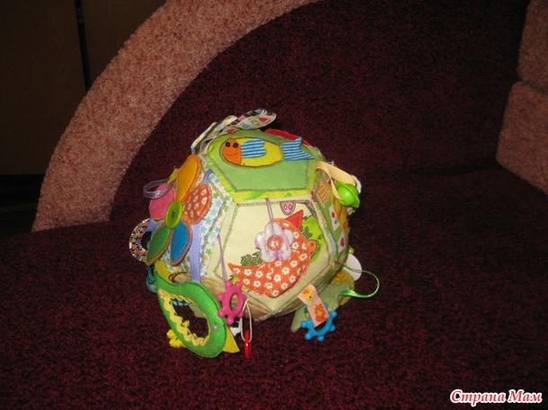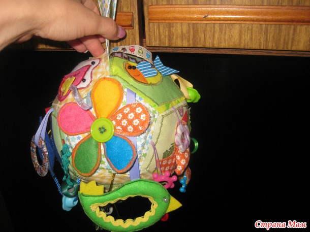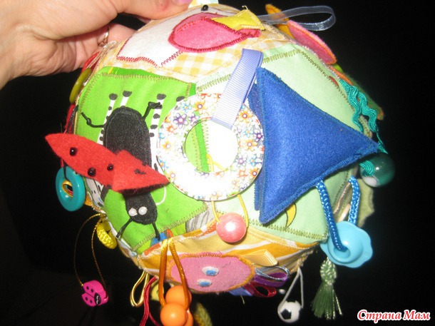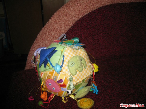 Развивающий мячик в моем исполнении- для маленького ребенка, до года. Каждая грань с шитой аппликацией, разные фактуры и наполнители. Подвески тоже всякие-разные, вязаный кружочек- это пищалка.