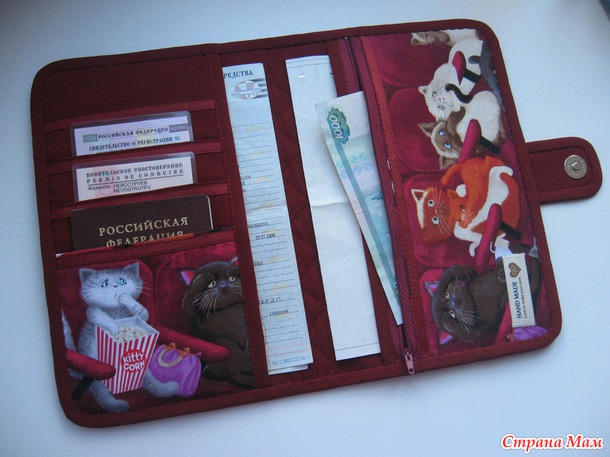 Вобщем, органайзер для документов. Внутренний мир- кармашки для паспорта, прав, свидетельства права собственности на транспорт, техосмотра. В большие отделения поместятся документы формата А5, ну и, соответственно, сложенные А4. Справа- кармашек на молнии для особо ценных или секретно-важных