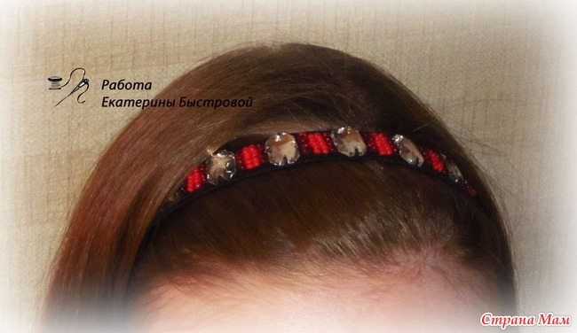 Резинка-ободок, расшитая бисером 2х оттенков красного и пришивными стразами. Можно одевать и как простой ободок, и как ободок для греческой причёски. Я делала специально под своё красное платье.