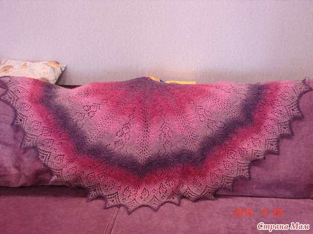Начну пожалуй с шальки, связанной спицами. Это самая моя большая гордость - шалька "Фортуна", связана спицами адди 3,5, ниточки Кауни 8/1 Фуксия.