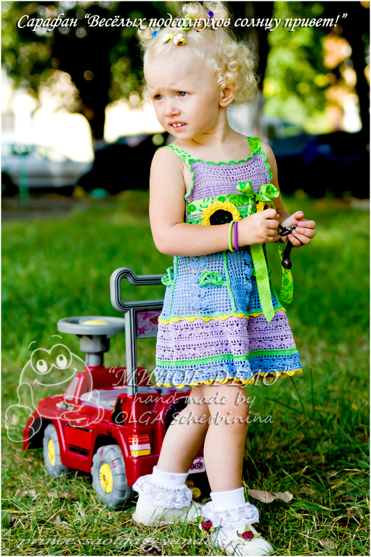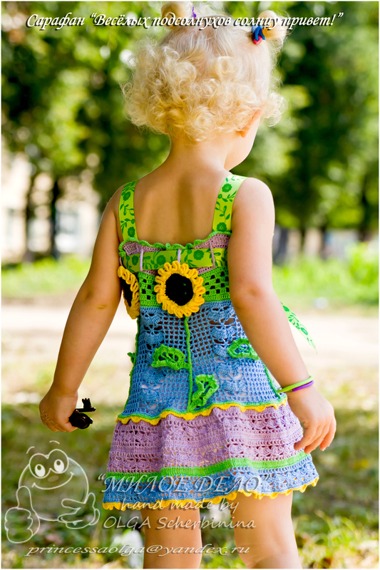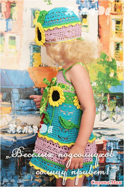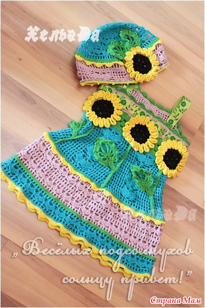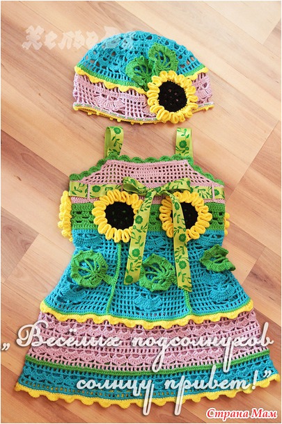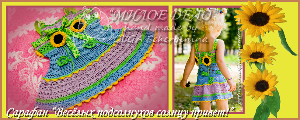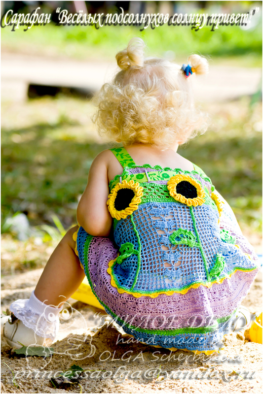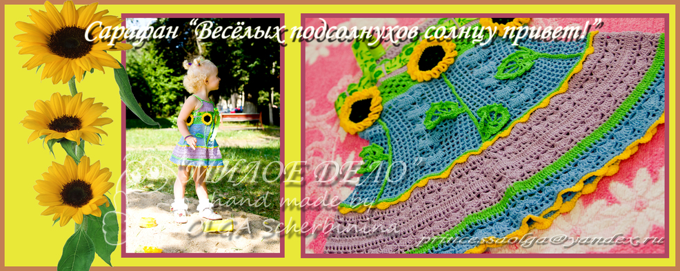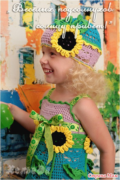 Придумался два года назад у меня сарафанчик для дочки с подсолнухами, назвала его весело "Весёлых подсолнухов солнцу привет!", а в следующем году вязала такой же в комплекте с шапочкой, но уже на заказ и из других ниточек, чуть потолще. Оба варианта мне нравятся, оба любимы, а цветовое решение практически одинаковое, потому что заказчица пожелала комплект, как можно более похожий на оригинал. Работа авторская, на соседнем сайте девочки вяжут его онлайн. Описание я не составляла, как таковое, но объяснила, как вязать и предоставила схемки и фото.