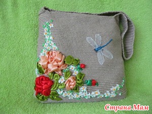 Очень красиво, и вышивка лентами очень нравится, только вот вопрос - а как ухаживать за такой сумочкой? Как поведет себя вышивка после стирки, например?. Я тоже увлекаюсь вязанием сумок и хочу освоить вышивку лентами по трикотажу. А сумочка смотрится классно!!!