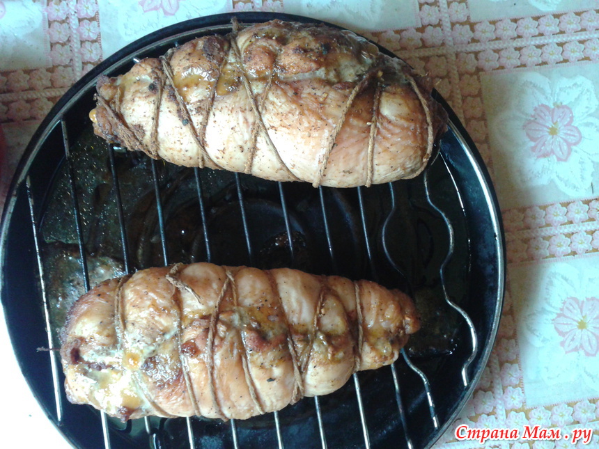 Ставим в разогретую духовку и запекаем при температуре 180-200 градусов 20 минут (если курица меньше 1 кг - достаточно 15 минут), выключаем, даем постоять еще минут 20. Рулет не будет пересушиваться будет допекаться изнутри.