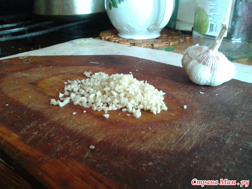 Предварительно режем чеснок (5-6 средних долек). Количество чеснока и степень его измельчения на любителя.