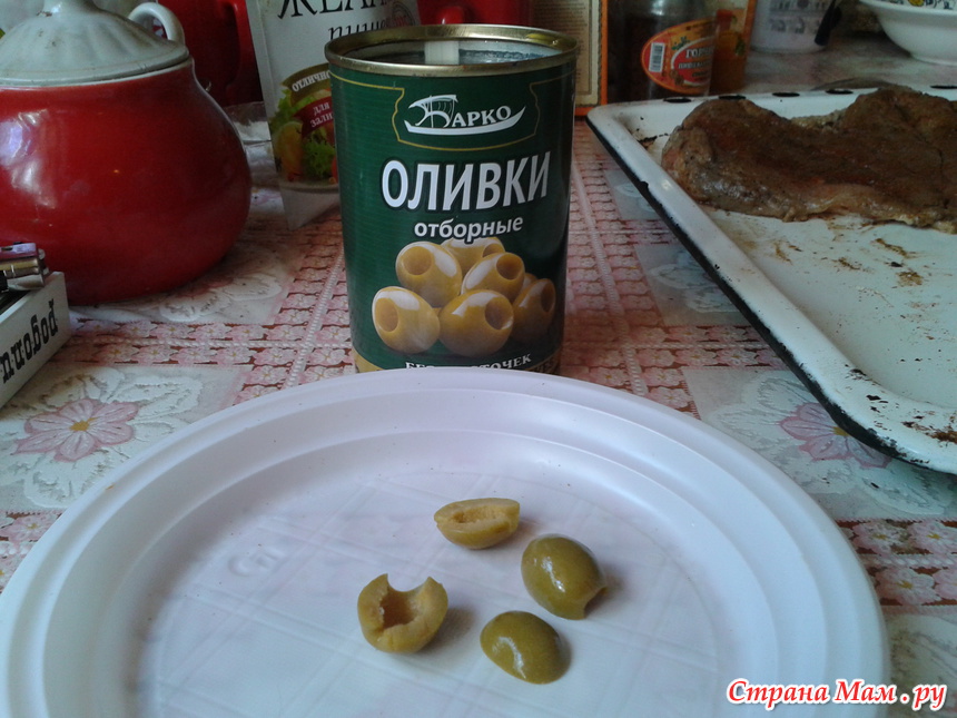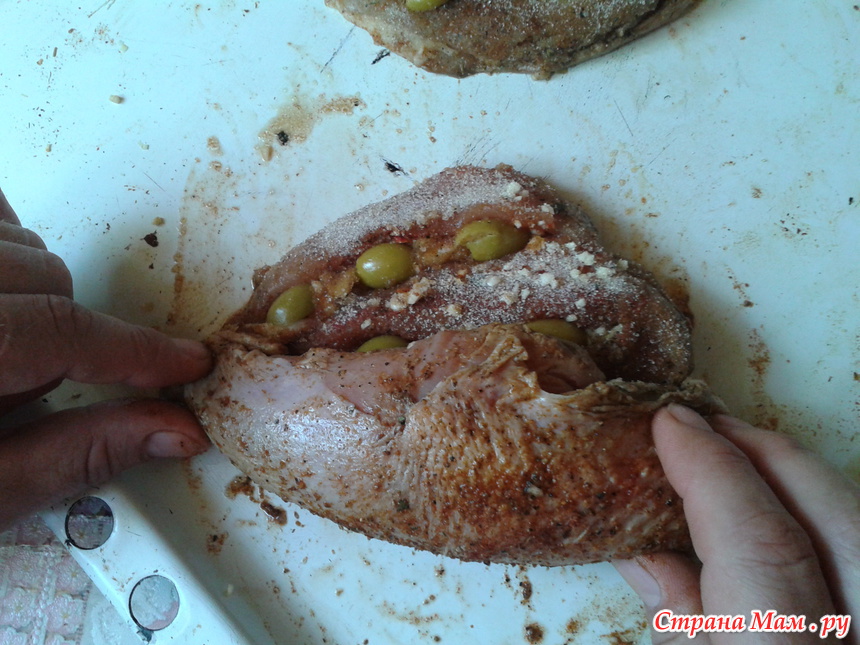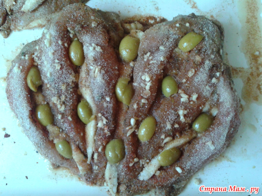 В эти же разрезы можно положит оливки, предварительно порезанные на половинки