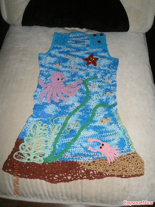 Давно хотела связать платье с морской тематикой. Недавно старшая внучка посмотрела мультфильм "Русалочка", он ей очень понравился. и моя "хотелка" удачно воплотилась в жизнь.