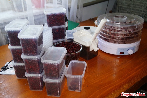 Меняю местами верхние и нижние лотки, так как не равномерно внизу и вверху сушатся вишенки. В одной сушилке приходится поворачивать лотки. После того, как вишни остыли, перебираю их - выбираю высохшие - на лотке тоже не все разом вишни сохнут. Главное не довести вишни до состояния камушка. Вишня должна быть мягкая, как бы резинистая (как чернослив... я на него ориентируюсь).