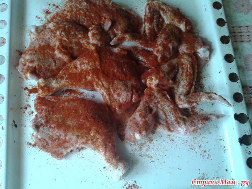 Окорочка от одной курицы, разделенные на бедро и голень, складываем на подложку, обмазываем майонезом,