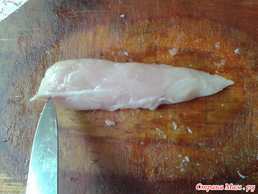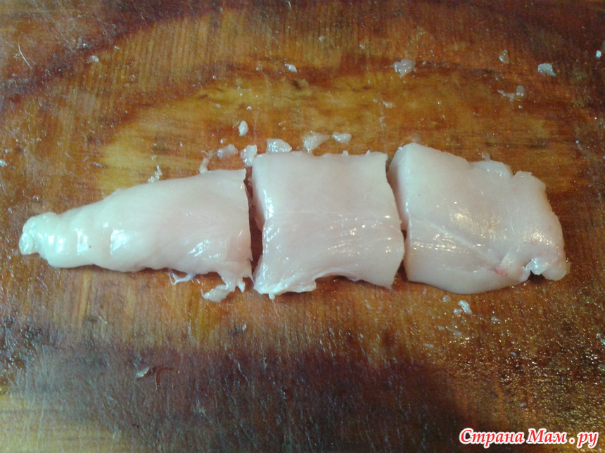 Малую грудную мышцу разрезаем на порционные кусочки: каждую мышцу на три части.