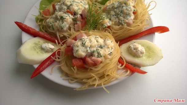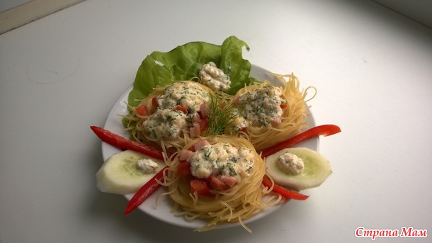 Варим гнёзда как написано на упаковке и складываем в форму смазанную маслом ( чтоб потом запекать можно было).
