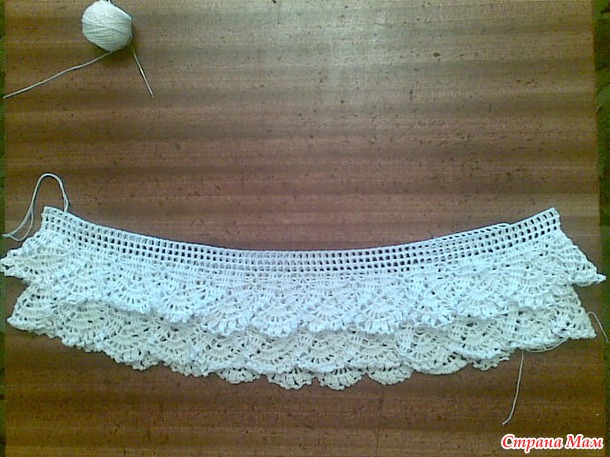 Переход от оборки к оборке. Привязываемся к верху получившейся оборки (к 14-ому ряду по схеме) и вяжем филейную сетку (ст. с/н, в. п., ст. с/н) 6 рядов. У меня между оборками по 7 филейных рядов, оборочки получились немножно внахлест, чтобы обойтись без подъюбника.