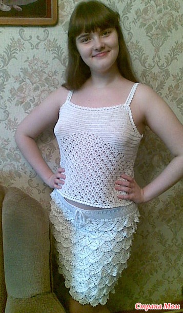 1. Расчет. Измеряем окружность груди и бедер в см. Снизу ширина юбки будет равняться окружности бедер (можно и больше, кому как нравится), а сверху (на талии) - окружности груди. Вяжем пробник из желаемых ниток (цепочку длиной в один-два раппорта), измеряем и соответственно результату высчитываем нужное количество раппортов по низу (у меня 23) и по верху юбки (у меня 21). Юбку будем вязать снизу, а на верхних ярусах нужно будет убрать 2 раппорта для приталивания (я убирала по одному в двух верхних ярусах).