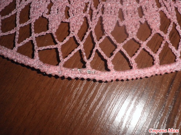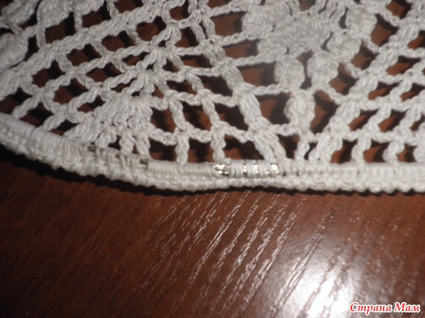 В последнем ряду (обвязку цепочками из воздушных петель не делала) ввязывала 2 лески из регилина. Прежде чем вставлять регилин, шляпу надо хорошо отутюжить. Скрепляла регилин вот этими не ржавеющими штучками, купленными в отделе с фурнитурой.