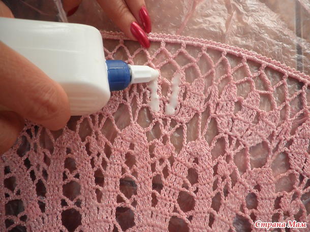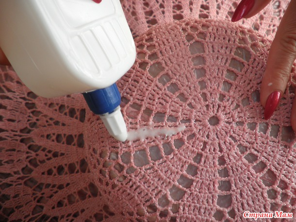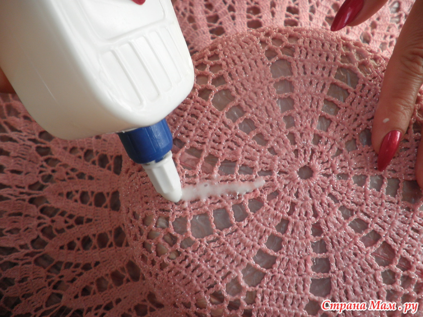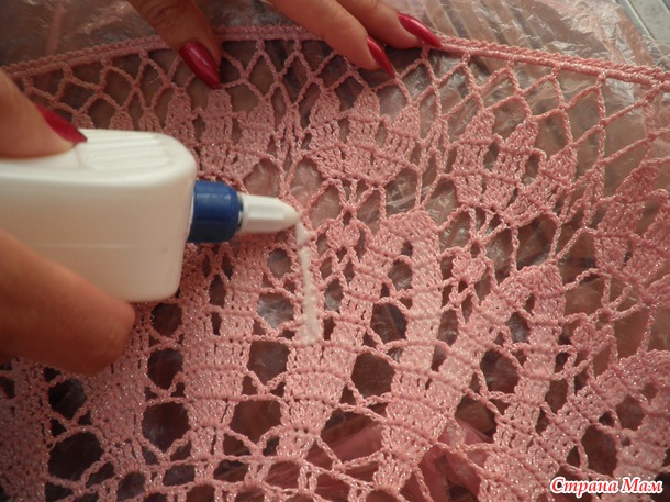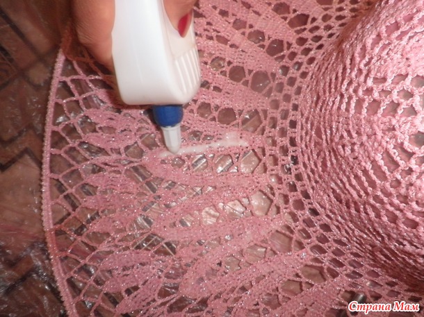 Готовые сухие шляпы натягивала на подходящую по размеру кастрюлю (покрытую целлофаном), поля раскладывала на полу на балконе и крахмалила клеем ПВА. Разводила так: 1 часть клея на 2 части воды. Из бутылочки поливала шляпу, вбивала клей пальцами в полотно (как мы вбиваем крем в кожу лица).