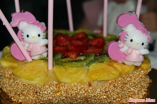 на вид ничего особенного... без всяких там фигурок из мультиков и прочего... но на вкус... мммм... это что-то необыкновенное: тающий бисквит с заварным кремом и сверху свежие фрукты в желе, мои девчонки обычно торты не особо жалуют, им больше рыбку и мяско подавай, но этот они лопали)))
