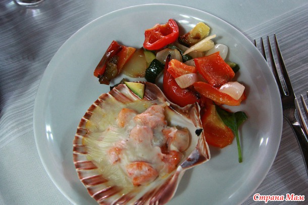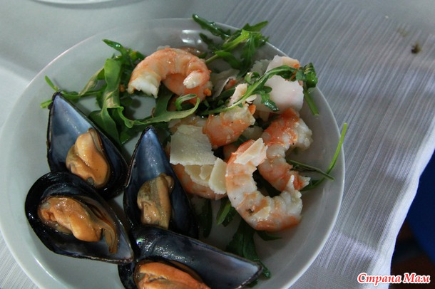конечно там были не только морепродукты (а их было больше чем достаточно и на любой вкус, в "закусках" всегда были королевские креветки, мидии, осьминоги и прочее очень по-разному приготовленные, были сибас, дорада и прочие вкусные рыбки которые готовили на гриле прямо при нас, также была какая нибудь огромная, размером с молочного поросенка рыбка приготовленная целиком различными способами, кстати молочный поросенок целиком тоже частенько был, а также что-то типа буженины, запеченое мясо в хлебе (опять же размером с того самого поросенка))), естественно (ну Италия же!!!) море всякой пасты и лазаньи и прочего, и несмотря на то, что муж это не особо любит, там ему и "макароны" понравились, много овощей, обожаемой мной моцареллы, малыши у меня вообще готовы были питаться одними креветками и "шариками" (моцареллой))), ну и конечно же там роскошные десерты