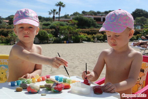 но мы придумали способ!! я взяла из дома акриловые краски и мы раскрашивали камушки: и детям удовольствие и мама спокойна, что ничего (как дома) не перепачкаем)))