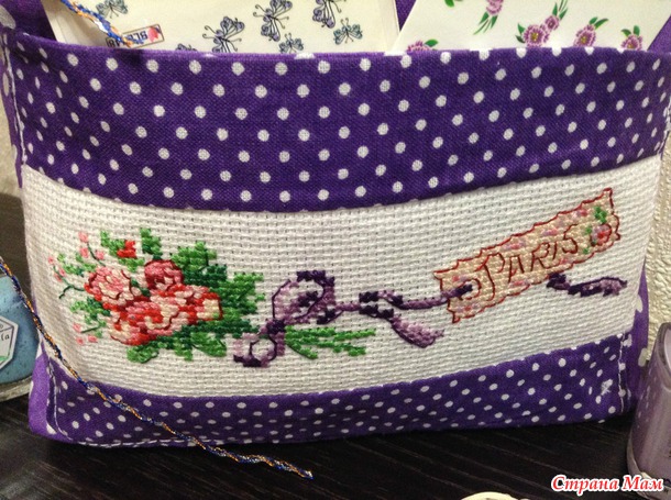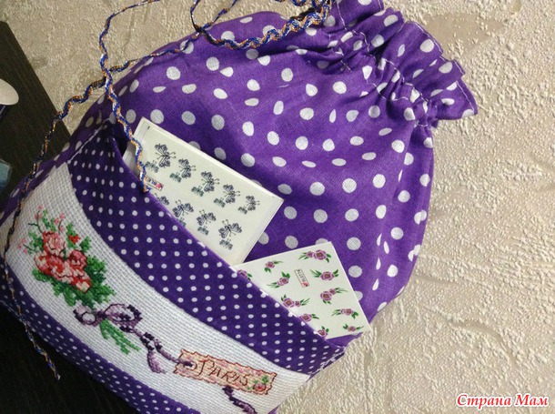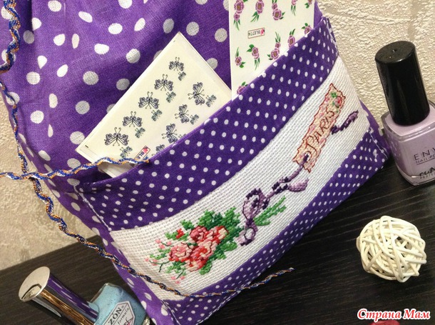И вот результат трудов двух вечеров. Букетик вышивала на ленточной канве нитками dmc, ткань для печворка фиолетового цвета в большой и малый горох, лента для вставки в кулиску. Бантик на букете заменила на фиолетовой под цвет ткани. Все лаки поместились в мешочке, а наклейки для декора в кармашке.