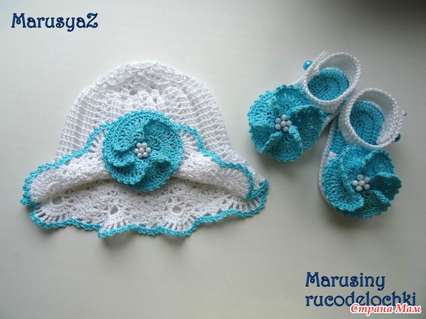 Комплект связан из высококачественного хлопка. Цветы съёмные на кнопках, цветок на панаме с булавочкой для броши.