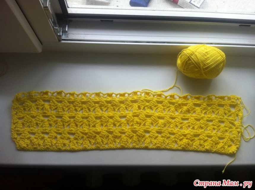 А вот и мое начало. В первом ряду вместо трех столбиков с накидом я вяжу три столбика с двумя накидами, а вместо столбика без накида делаю столбик с накидом. Так изделие получается более ажурным.