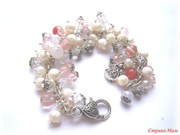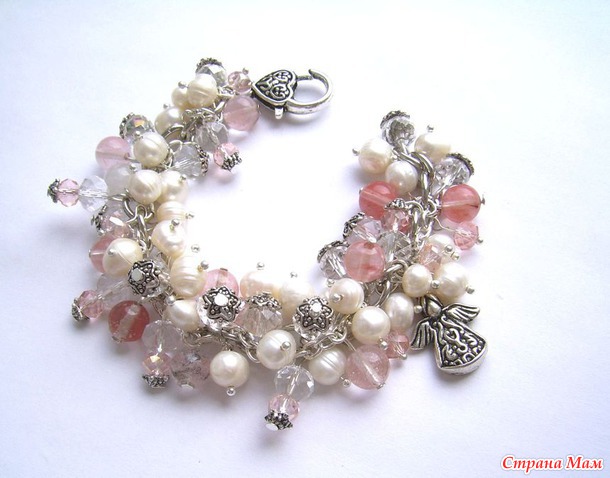 Яркий, искрящийся, нежный браслет в розовых пастельных тонах. Браслет выполнен из жемчуга, турмалина, граненых стеклянных бусин и фурнитуры под серебро. Подвеска в виде Ангела. Читать полностью