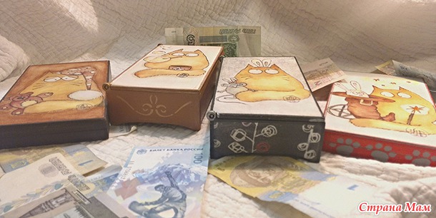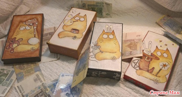 Вот такое семейство купюрниц по мотивам худжницы Maria-van-Bruggen у меня получилось. Делала с распечатками. Не смотря на схожесть сюжета, хотелось сделать работы разными, не похожими друг на друга.