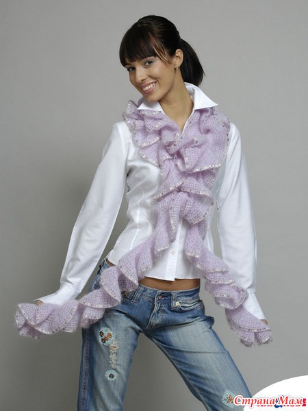 Описание работы: пряжей CAMELOT в 2 нити связать цепочку из возд. п. длиной 2 м 30 см, обвязать ее с обеих сторон 1 р. ст. б/н, соединив соед. ст. последний и 1-й ст. б/н (= 1-й р.). 2-й р.: 3 возд. п. подъема, вязать по кругу, как 1-й р., делая для закругления на концах полоски по 2 ст. б/н в ст. б/н предыдущего ряда. Продолжить пряжей CAMELOT в 1 нить. 3-й р.: 3 возд. п. подъема, по 2 ст. с/н в каждый ст. б/н предыдущего ряда. 4-й р.: 3 возд. п. подъема, попеременно 2 ст. с/н в каждый ст. с/н предыдущего ряда, 1 возд. п. 5-й, 7-й р.: 3 возд. п. подъема, * 1 ст. с/н в ст. с/н предыдущего ряда, 1 возд. п., 2 ст. с/н в ст. с/н предыдущего ряда, 1 возд. п., повторять от *. 6-й, 8-й р.: 3 возд. п. подъема, * 1 возд. п., 1 ст. с/н в ст. с/н предыдущего ряда, повторить от *. Через отверстия последнего ряда протянуть пряжу CRISTALLO (см. фото).