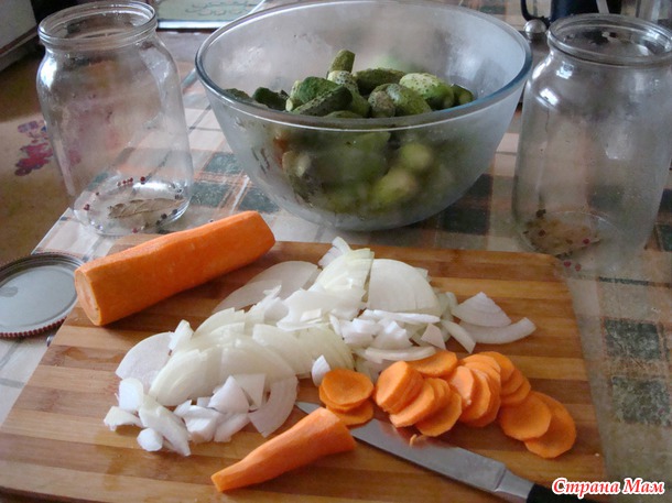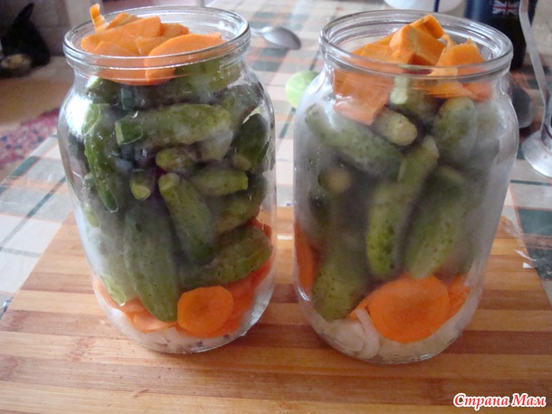 Состав на 1 л банку: 1 небольшая луковица, 1 морковь, маленькие огурчики, перец горошком (2-5 шт.), лавровый лист (1 шт.), 2 чайные ложки соли, 3 столовые ложки сахара, 100 мл уксуса 9%-ного
