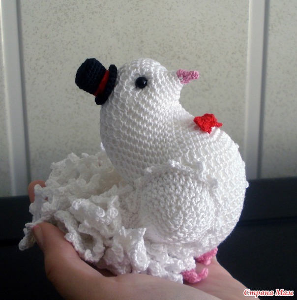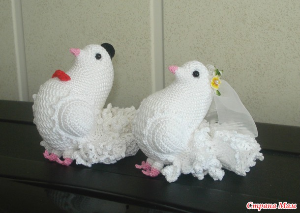 Пара голубей в подарок на свадьбу связаны по авторскому описанию Лены Ями, за что ей бесконечная благодарность Цитировать фото жених связан из "Ромашки" и получился около 10см, а невеста из "СОСО" - всего 8 см. Читать полностью