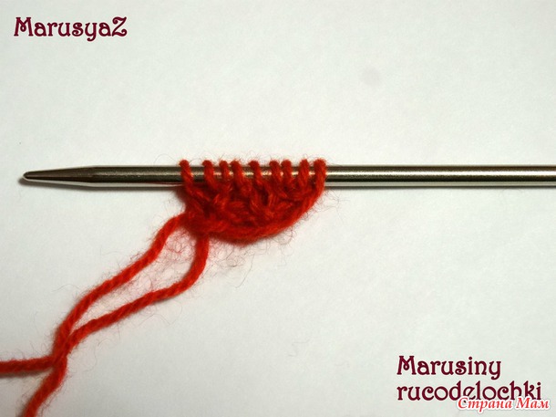 Потом, не снимая петель со спицы, поднимаем 3 петли по краю ленточки и 3 оставшиеся петли с левого края ленточки. Итого 9 петель = 3 + 3 + 3