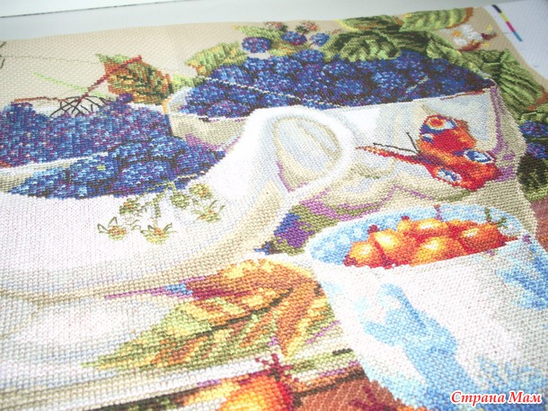 Вышивка на авторской канве, с нанесенным фоном, бабочка в левом верхнем углу нарисованная, все остальное вышито.