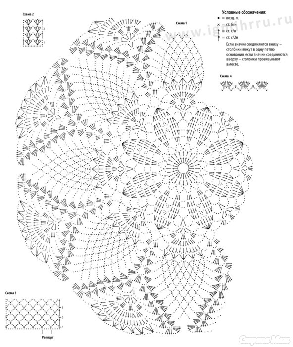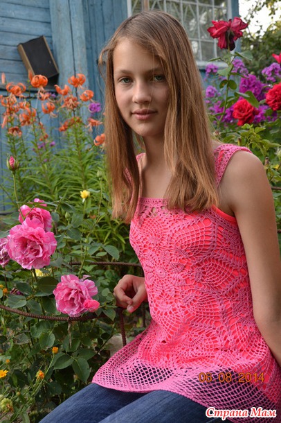 Сборка: когда оба мотива будут готовы, разложите их на выкройке и приступите к вязанию бретелей. Выполните боковые швы и сформируйте бретели так, чтобы узор расположился следующим образом: по 3 лепестка «ананаса» сверху оставьте несшитыми, один лепесток останется посередине, а два по краям - левая и правая бретели. К этим петлям наберите по 12 п. и вяжите бретели по схеме 2 до высоты линии проймы 25 см. Бретели на спинке вяжутся аналогично. Далее по нижнему краю наберите петли и вяжите по кругу сеткой по схеме 3 до нужной длины изделия. По низу платья свяжите кайму по схеме 4.