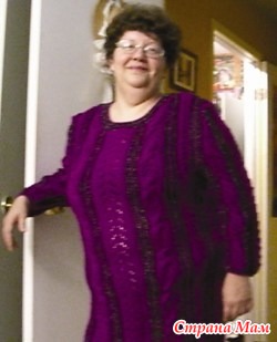 Сначала вяжется лиловая полоса произвольной ширины любым красивым ажурным узором, какой придет вам в голову. Полоса должна быть такой длины, какой вы предполагаете сделать свой свитер. Потом черными нитками с обеих сторон полоса обвязывается рядом столбиков с накидом; затем ряд столбиков без накида лиловой пряжей; снова ряд черных столбиков с накидом.