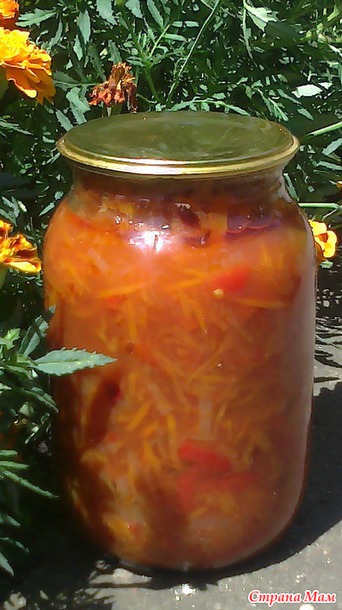 Надо : 4 литра томата, 2 кг моркови ( тертой на корейской терке ) 2 кг лука, 2 кг перца болгарского и красного и зеленого. Лук и перец шинкуется мелко. 1 стакан 9% уксуса, 4 стол. ложки соли, 2 стакана растительного масла, 2 стакана сахара. Все вариться по очереди, то есть сперва проварить томат, потом добавить морковь кипятить 15 мин, после лук добавить, кипятить 15 мин, затем добавить перец и остальные ингридиенты согласно рецепту. Прокипятить еще 15 мин и закатывать. Не стерелизую.