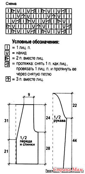 Перейти на спицы № 2 4,5 и вязать лиц. гладью, через 31 см для скосов реглана закрыть с обеих сторон 1 х 2 п. и затем убавлять после 2 первых и перед 2 последними петлями в каждом 2-м р. 24 х 1 п.