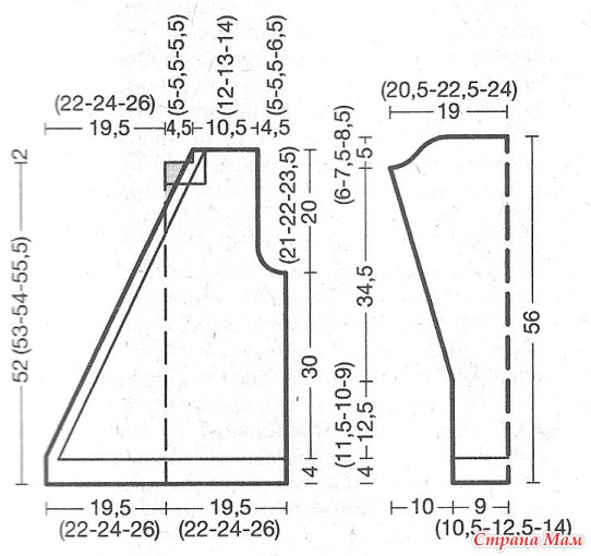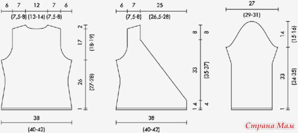 Через 54 см = 114 р. (54 см = 114 р.) 59 см = 124 р. от резинки закрыть для скосов плеча с обеих сторон 6 (6) 8 п ив каждом 2-м р. 2 х 5 (7) 8 п.