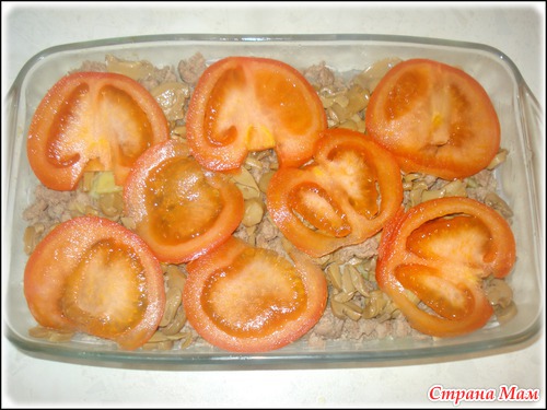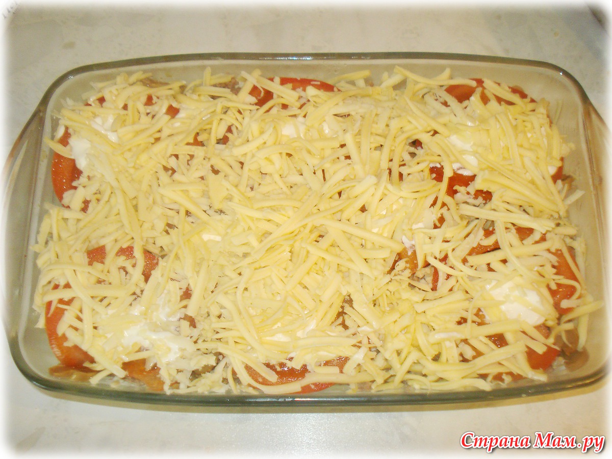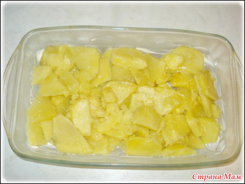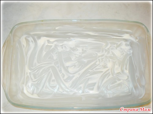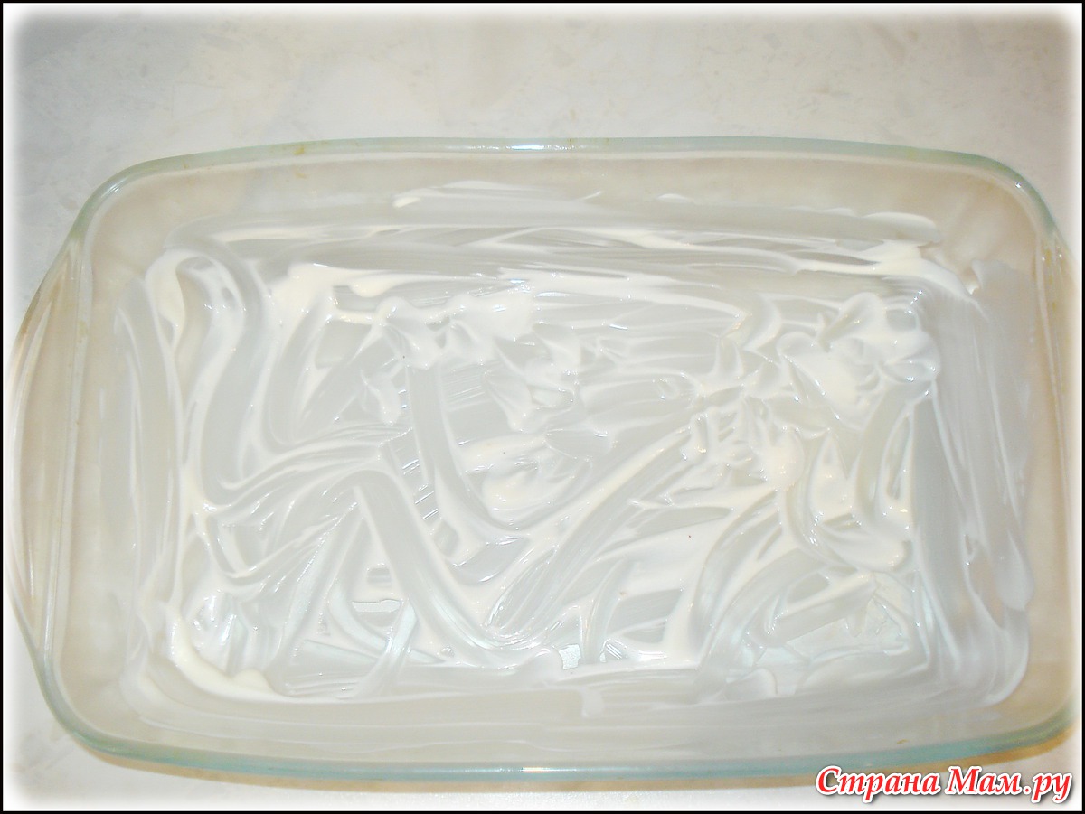 Смазываю форму майонезом. И выкладываю слоями.