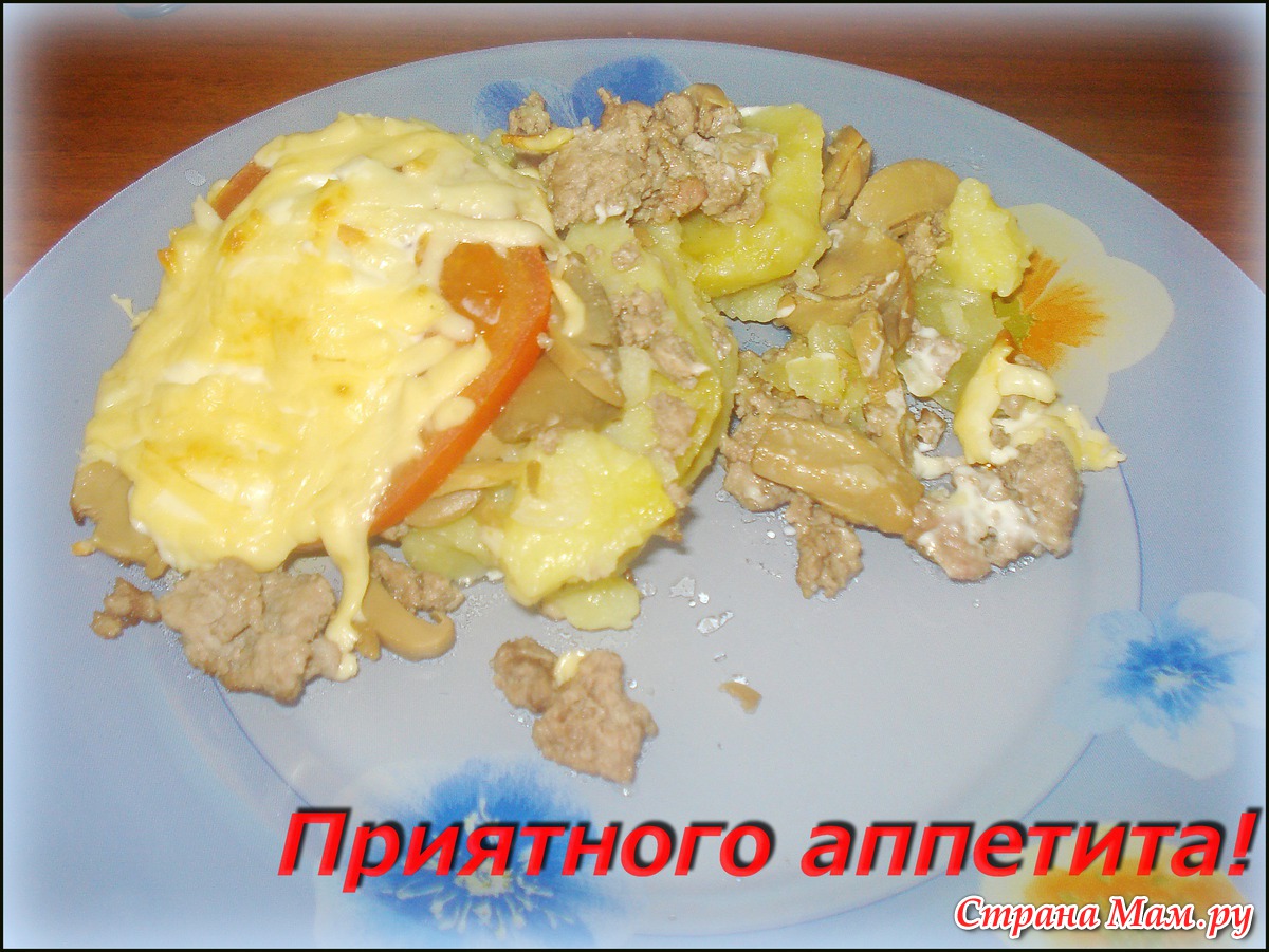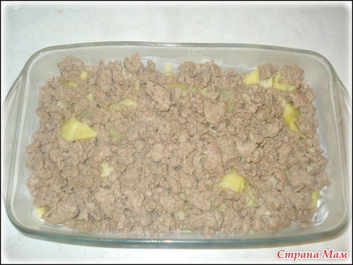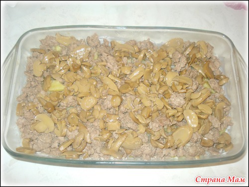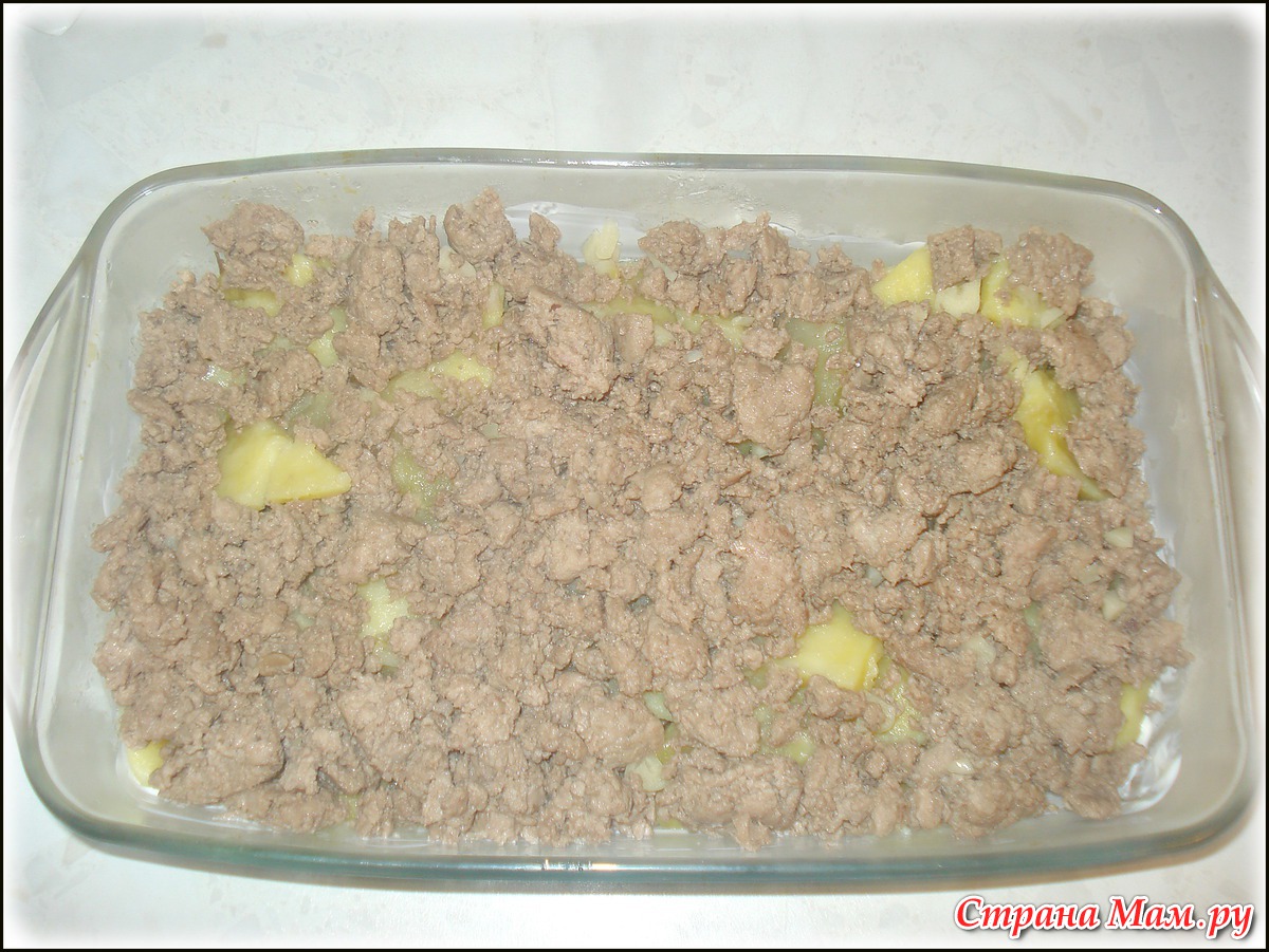 Второй слой: мясной фарш. (Вместо фарша можно положить отварные кусочки курицы, говядины или свинины)