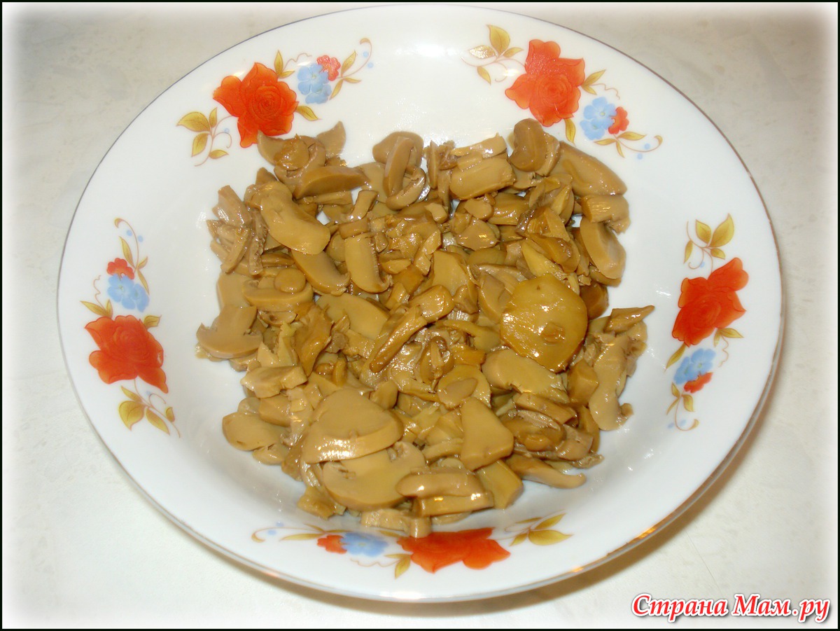 Для начала я обжариваю грибы. Для этого беру резанные шампиньоны в банках.