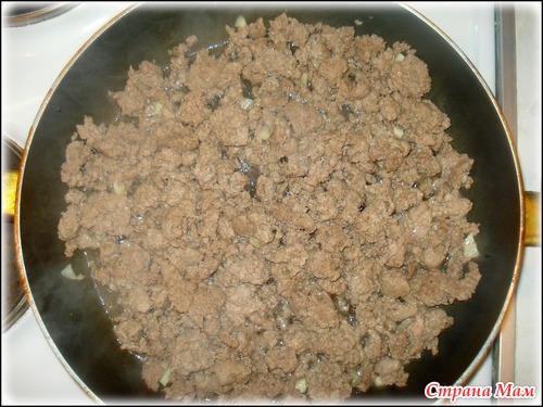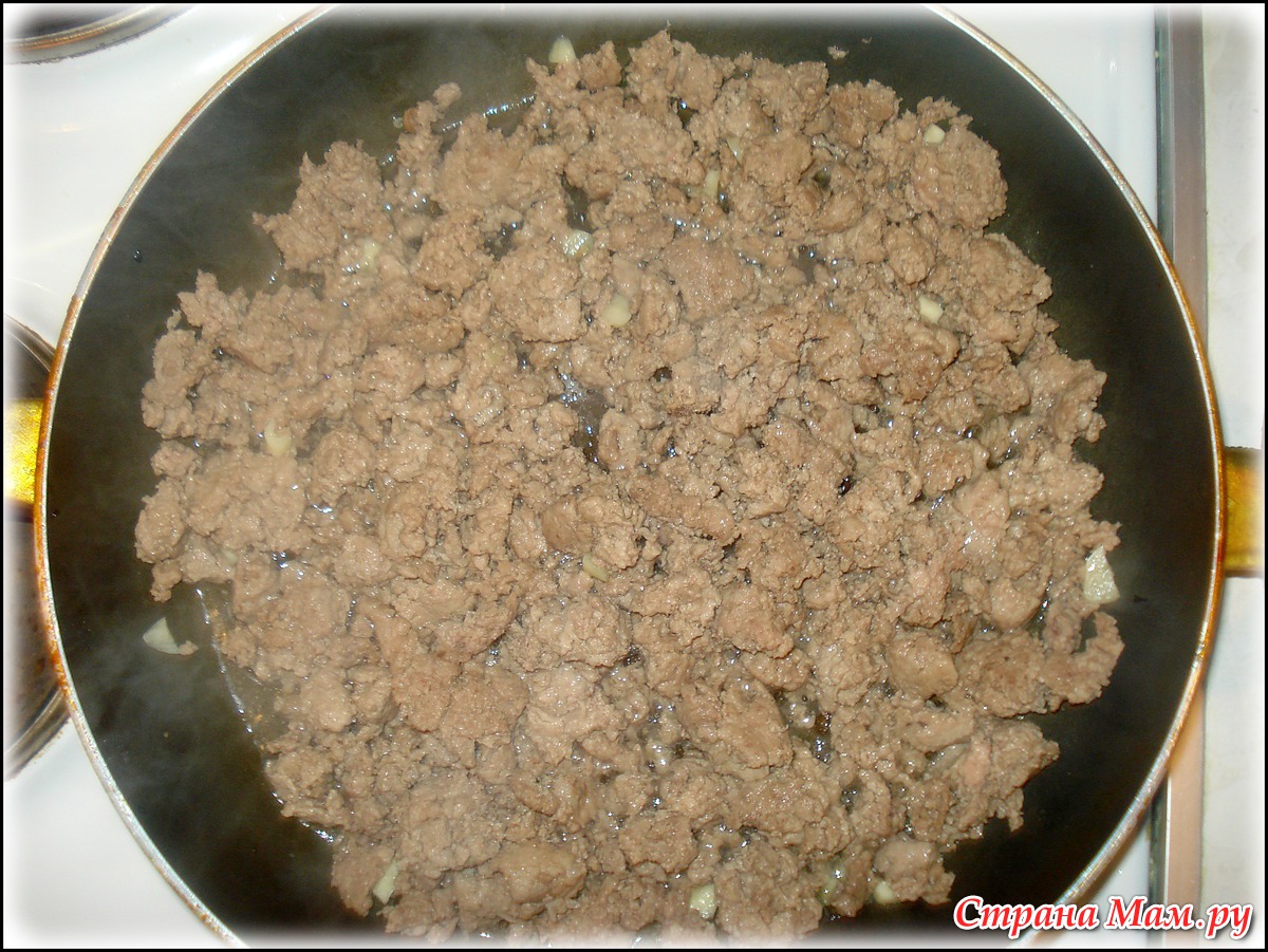 Следом обжариваю мясной фарш с чесночком. Это может быть фарш свинины или говядины или индейки, на ваш вкус.
