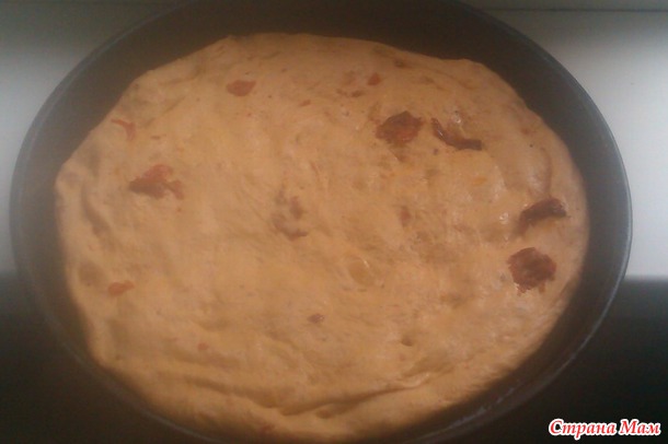 Тесто растянуть на весь противень аккуратно смазанными маслом руками.