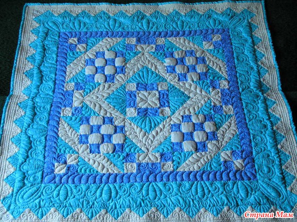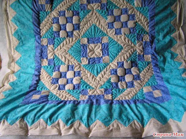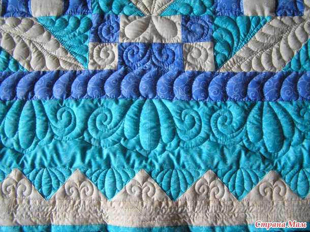 Конечно, прежде чем начать стегать бордюр, к примеру, чтобы вписать рисунок в размер одеяла, я делю бордюр на равные отрезки, и в каждый отмеченный отрезок "вписываю" рисунок стежки, потом повторяю его.