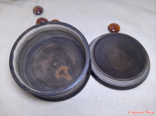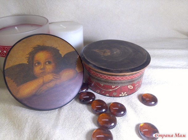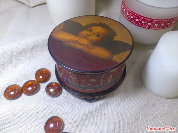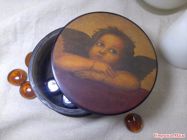 Шкатулка-малышка. Сделала на одном дыхании. Сверху и сбоку - салфетка, внутри и снизу - морилка, по краю - битум и бронза. Решила в экспериментах со своим скатывающимся комками лаком Кива, начать с самого простого из советов девочек - разбавила чуть водичкой и покрывала шкатулочку им. Лак лег идеально, я в полном восторге!!! Такая поверхность получается, словами не передать - бархатистая, гладкая, без лишнего глянца. Шкатулку прям из рук выпускать не хочется! Я теперь этот лак ни на какой другой не променяю. Смотрите какая получилась: