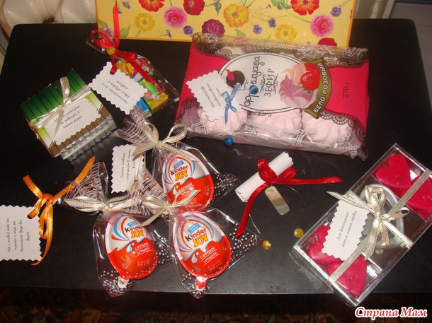 здесь набор шоколадок с изображениями разных цветов... и пакетик жвачек "Love is..."
