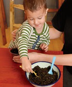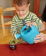 Наполните стаканчики на ½ землей и дайте малышу на сыпать в них семя на, перемешать и полить (совет – чтобы семена быстрей проросли можно их заранее замочить в воде и дать постоять ночь)