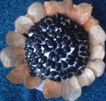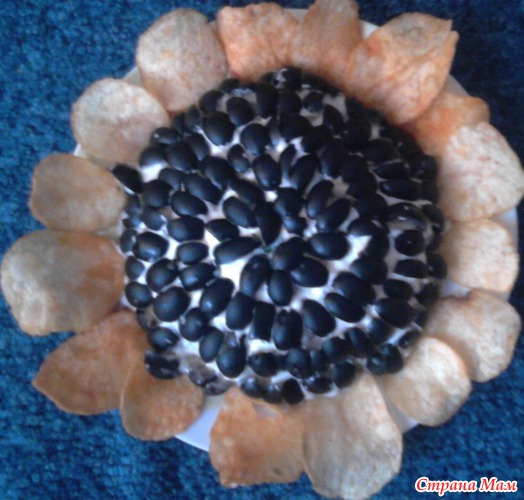 Отваритьяйца, филе, грибы нарезать, посолить, поперчить и обжарить. Все нарезать небольшими кусочками и выкладывать слоями: филе, грибы, огурец, яйца каждый слой смазыватьмайонезом. Оливки разрезать на четыре кусочка и выложить на салат будтосемечки подсолнуха, а чипсами украсить вокруг салата.