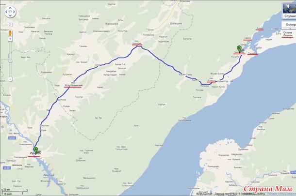Во-первых, мой муж осторожно водит всегда, а особенно, когда “за спиной”” двое детей (ехали по хорошему участку пути около 90 км/ч иногда 100-110, что, на мой взгляд, и есть предел максимальной скорости для России, в которой не только дороги оставляют желать лучшего, но и дураки на этих дорогах попадаются прискорбно часто). Во-вторых, замедляло продвижение то, что эту дорогу Володя не очень хорошо знает (на Байкал редко выбираемся), а участок в 30 км, стыдливо обозначенный на карте, как «лесная дорога» преодолевался нами впервые. И, в-третьих, у нас сейчас не просто “городская” машина, а недорогая городская машина (корейский Хёндай Солярис), которая действительно не выдерживает испытания плохими российскими дорогами, и вышеупомянутые 30 км пути по бездорожью мы преодолевали на первой передаче со скоростью 10 км в час (максимум 30).