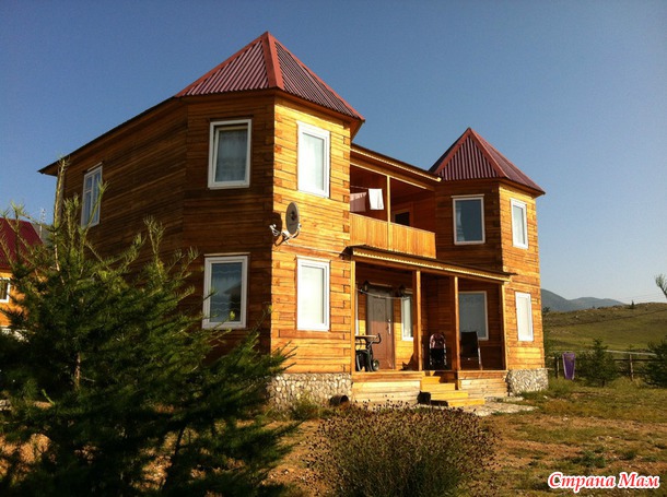 Ещё вид с балкона, видно баньку-строение справа с красной крышей (чудесно попарились в ней) и мангал с кострищем (варили уху из омуля на костре и ели, сидя у костра под звёздным небом, было очень вкусно, очень романтично (и очень дорогая рыба – 280 руб за кг):