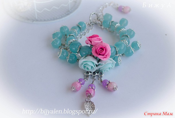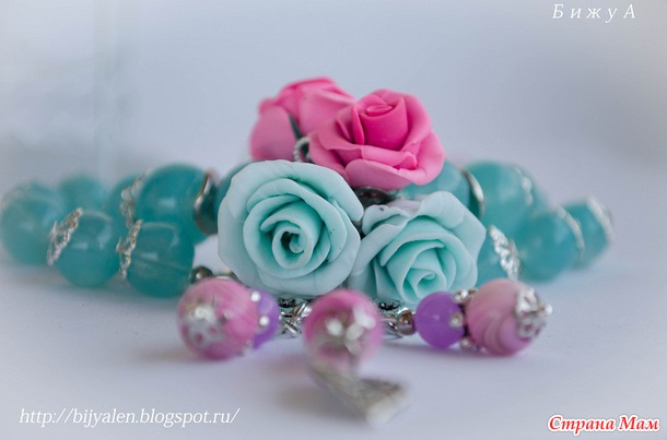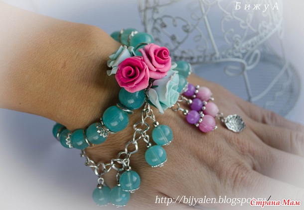 Собран на ювелирном тросик, очень прочный, прослужит Вам не один год. Застежка тогл и бусины на цепочке, как волны теплого моря. Стеклянные бусины, фурнитура античное серебро. Розочки слеплены вручную, без приспособлений.