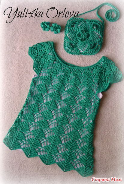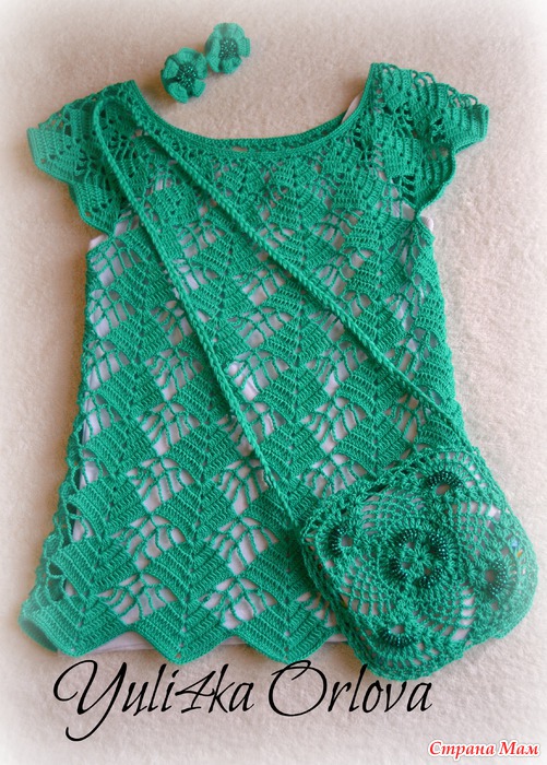 Всем здравствуйте!!! Я к вам с новыми работами... уже на новом месте жительства (живу теперь в Самаре)... Связался у меня комплект для доченьки "Изумрудный день" (обожаю этот цвет) всем известная туника (здесь проходил он-лайн Http://www.stranamam.ru/post/7521865/ ) сумочка и две новеньких резиночки для волос. Пряжа Вита Пеликан, крючок 1.25. Приятного просмотра и спасибо за внимание!!!